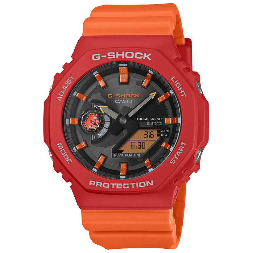 G-SHOCK x Charles Darwin Foundation – hylla Galápagos med hållbar design Visa ditt engagemang för Galápagosöarna med en exklusiv G-SHOCK-samarbetsklocka skapad tillsammans med Charles Darwin Foundation. Två modeller hyllar ikoniska arter från dessa fantastiska öar: Galápagos Albatross och Sally Lightfoot Crab. Byggd på GA-B2100 med Smartphone Link och Tough Solar-laddning, har klockorna band och boett i biobaserad resin från förnybara resurser. Funktionerna och materialen är miljöfokuserade, medan färgpalett och detaljer hyllar öarnas unika djurliv. GA-B2100DF-4A hedrar Sally Lightfoot Crab, som lever på öarnas klippiga stränder och sanddyner. Den vivid röda och orange färgsättningen speglar krabbans lekfulla karaktär, och en illustration av krabban med lyfta klor syns på både indikatorvisaren och bandets ögla. Urtavlan visar även en silhuett av Galápagosöarna. Baksidan är graverad med Charles Darwin Foundation-logotypen och namn på spanska, medan bandet pryds av texten “Apoyo la conservación de Galápagos”, som betyder ”Jag stödjer Galápagos bevarande”. Klockorna levereras i specialdesignad plastfri förpackning, vilket förstärker samarbetets miljömedvetna fokus och gör varje modell till ett hållbart och unikt samlarobjekt.