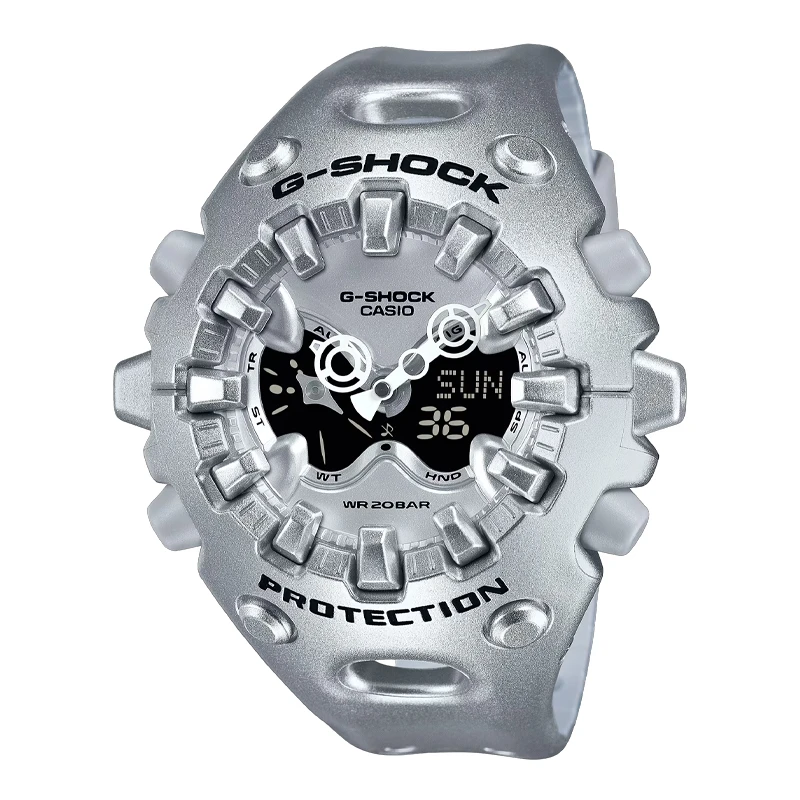 Det första som slår en är klockans unika form. Den har en organisk siluett där mjuka linjer möter skarpa kanter, som om den vore framtagen ur en enda solid struktur. Den stora fullskärms‑LCD:n dominerar fronten och ger klockan ett modernt, nästan futuristiskt uttryck. Ovanpå skärmen ligger en metallisk urtavla med öppna detaljer som skapar djup och ger en känsla av mekanisk precision. Kombinationen av digital tydlighet och industriell design gör att GA‑V01 känns lika mycket som ett verktyg som ett tekniskt smycke. Den utstrålar G‑SHOCK‑tuffhet i varje detalj och förmedlar varumärkets eviga drivkraft att tänja gränserna.
