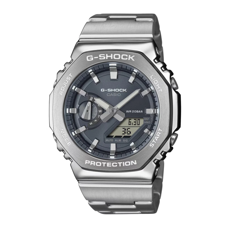 GM‑2110D är klockan för dig som vill ta den ikoniska GA‑2100‑designen till nästa nivå. Här möter den välkända analoga‑digitala layouten en uppdaterad look med metallbezel och metalllänk – en kombination som ger modellen en helt ny tyngd, både visuellt och känslomässigt. Det är en klocka som signalerar att du menar allvar, oavsett om du är på jobbet, på gymmet eller ute på stan.