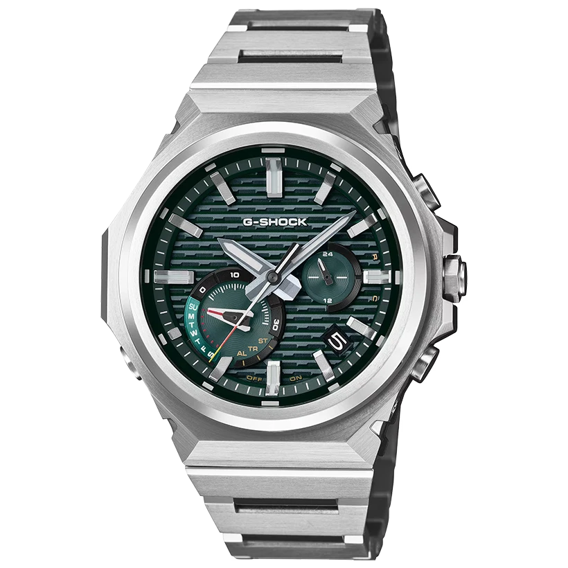 Länken i massivt rostfritt stål har en kombination av borstade och polerade ytor som skapar en levande metallstruktur som förändras med ljuset. Det ger klockan en ren, modern känsla som fungerar lika bra till skjorta som till T‑shirt. Den tunna och lätta konstruktionen gör den skön att bära hela dagen, samtidigt som den tål hårdare användning tack vare G‑SHOCKs välkända stötskydd och Carbon Core Guard‑konstruktion.