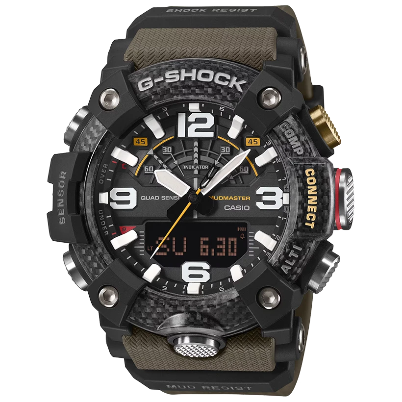 MUDMASTER GG-B100X använder kolfiberförstärkt resin med hög styvhet i boetten för att motverka skador och deformation samt säkerställa en tät konstruktion med utmärkt stöttålighet. Med filter som skyddar mot smuts, baklock i rostfritt stål och en baksida i stöttålig finresin förstärkt med glasfiber, erbjuder den hög motståndskraft mot damm och lera. Bezeln är dessutom uppbyggd i tre lager finresin med kolfiberinlägg. Den robusta designen för tankarna till bränsledunkar monterade på terrängfordon som klarar de tuffaste underlagen. Viktiga komponenter i boett och armband är tillverkade av biobaserad resin, framställd av förnybara organiska resurser, vilket bidrar till minskad miljöpåverkan.