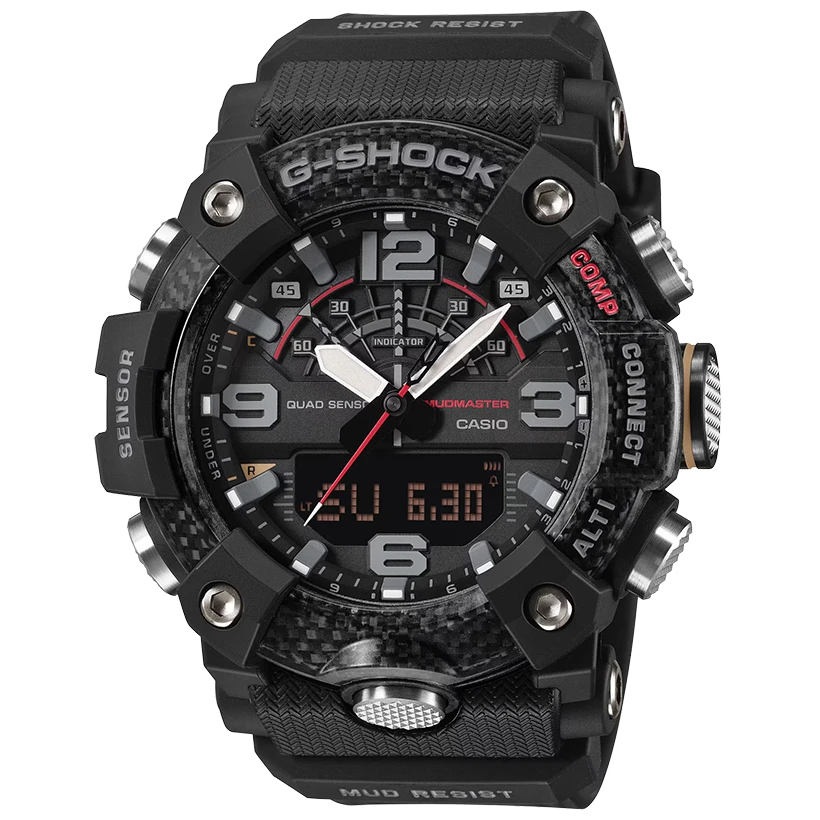 MUDMASTER GG-B100X använder kolfiberförstärkt resin med hög styvhet i boetten för att motverka skador och deformation samt säkerställa en tät konstruktion med utmärkt stöttålighet. Med filter som skyddar mot smuts, baklock i rostfritt stål och en baksida i stöttålig finresin förstärkt med glasfiber, erbjuder den hög motståndskraft mot damm och lera. Bezeln består dessutom av tre lager finresin med kolfiberinlägg. Den robusta designen för tankarna till bränsledunkar monterade på terrängfordon, byggda för att klara de mest utmanande underlagen. Viktiga komponenter i boett och armband är tillverkade av biobaserad resin, framställd av förnybara organiska resurser, vilket bidrar till minskad miljöpåverkan.