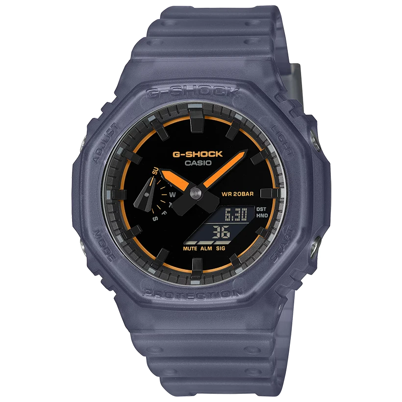 En nyutvecklad ytbehandling ger urtavlan en ren, slät finish som förstärker den stilrena siluetten i GA‑2100 serien. Den blanka ytan och den djupa pianolackssvarta färgtonen ger klockan en modern karaktär som står ut utan att bli påträngande. Färgdetaljer i neon påminner om nattens laserljus, medan den matta, nästan dimmiga strukturen på bezel och armband ger vibbar av rökmaskiner och dansgolv.