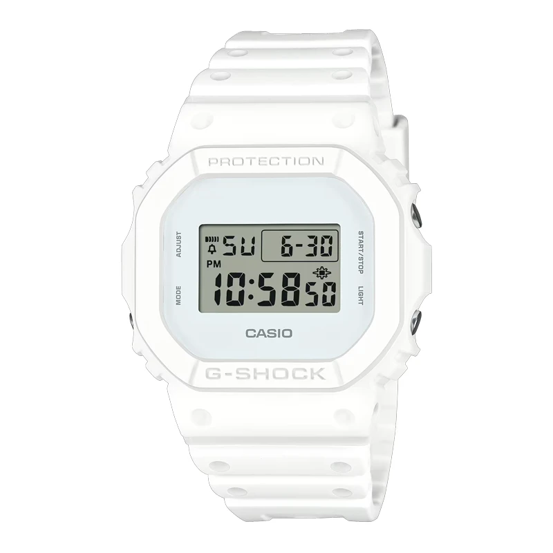 Trots sitt rena yttre är DW‑5600WW‑7 byggd med samma råa tålighet som gjort G‑SHOCK legendariskt. Boetten mäter 48,9 × 42,8 × 13,4 mm och väger endast 53 gram, vilket ger en lätt men robust känsla på handleden. Konstruktionen är stötsäker och klarar vatten ner till 200 meter – perfekt för allt från vardagsbruk till tuffare äventyr. Boett, bezel och band är tillverkade i resin och biobaserad resin, ett material som kombinerar slitstyrka med ett mer hållbart miljöavtryck.