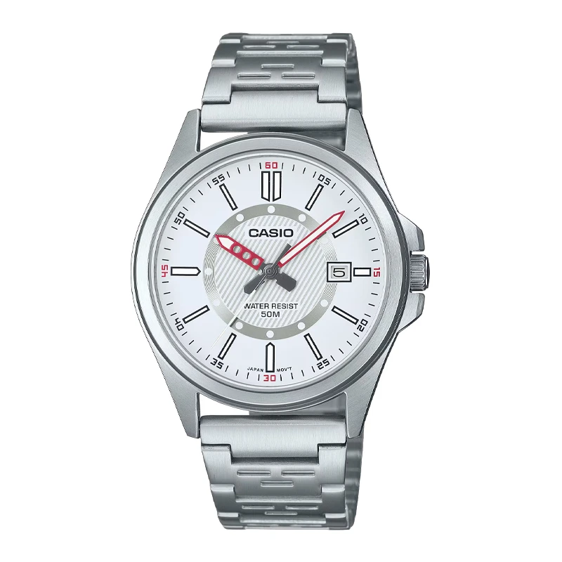 Gå sportigt och maskulint med en klassisk analog klocka med tim-, minut- och sekundvisare. Den smidiga datumvisningen och vattentätheten på 50 meter gör att du kan ta dig an dagen utan bekymmer, oavsett om du hamnar i regnet eller sköljer av disken.