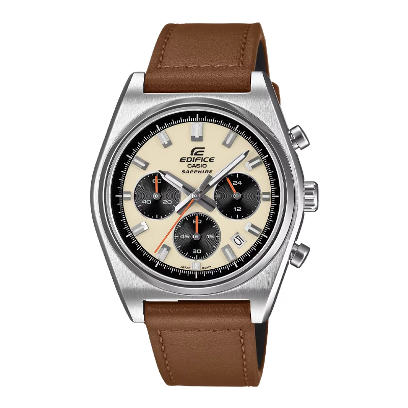EDIFICE Motorsports Chronograph är byggd för att användas, inte bara visas upp. Safirglaset ger en reptålighet som matchar de mest krävande dagarna, oavsett om du är på kontoret, i garaget eller ute på vägarna. Boetten i rostfritt stål ger en solid och trygg känsla, medan det äkta läderbandet tillför en maskulin elegans som bara blir snyggare med tiden. Med en vattentäthet på 10 bar, motsvarande 100 meter, klarar klockan både regn, svett och spontana äventyr. Den är konstruerad för att följa dig genom vardagens alla utmaningar – från träningspass till affärsresor.