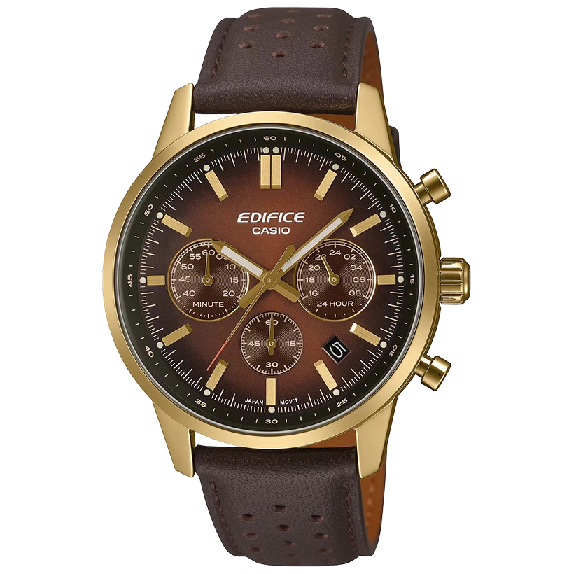 Casio Edifice kombinerar klassisk elegans med sportig funktionalitet, och denna modell är ett perfekt exempel på hur stil och prestanda möts. Den runda boetten i guldtonat rostfritt stål tillsammans med det bruna läderarmbandet skapar en varm, exklusiv och tidlös look. Den bruna urtavlan med stilrena streckindex förstärker helhetsintrycket och gör klockan lika snygg till vardags som till mer uppklädda tillfällen.