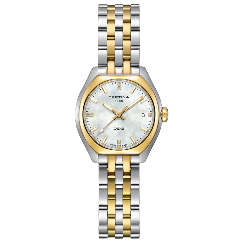Certina DS‑2 är en sofistikerad damklocka som kombinerar schweizisk precision med klassisk elegans. Den skimrande pärlemorsurtavlan ger ett exklusivt och kvinnligt uttryck, vackert inramad av en guldfärgad tavelring som skapar kontrast mot den silverfärgade boetten. Länken i tvåtonsstål förstärker den smyckesliknande känslan och gör klockan till ett perfekt val för både vardag och mer uppklädda tillfällen.