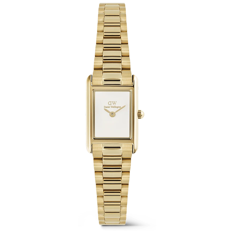 Från Daniel Welloington Bound-kollektionen är Bound Mini 3-Link Gold en kompakt rektangulär klocka som definieras av rena linjer och en ljusvit urtavla. Det guldfärgade 3-länkade armbandet i 316L rostfritt stål ramar in urtavlan med en raffinerad glöd, vilket skapar en modern, diskret look för vardagsbruk. DW designade denna lilla klocka för de som föredrar minimala detaljer och en tunn profil. Det japanska kvartsurverket håller tiden exakt, medan det dubbelsidiga fjärilsspännet gör stålremmen enkel att fästa och bekväm att bära. Den passar enkelt med skräddarsydda lager eller en enkel t-shirt, vilket ger en mjuk guldaccent utan att överväldiga din stil. Den är en omtänksam present till födelsedagar, alla hjärtans dag, jul, mors dag eller examen. Dess rektangulära silhuett och vita urtavla känns tidlösa, så mottagaren kan bära den vid speciella tillfällen och i vardagliga stunder. Varje detalj återspeglar noggrant hantverk. Vi använder 316L rostfritt stål för hållbarhet och en polerad finish som fångar ljuset mjukt. Det trelänkade armbandet är konstruerat för balans och flytande rörelse, och fjärilsspännet stängs med ett mjukt, säkert klick. Detta är premiumdesign gjord för att levas med och uppskattas över tid.