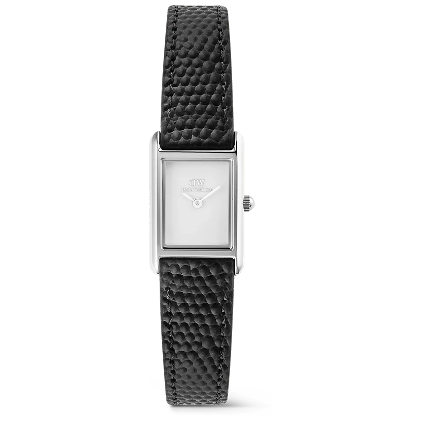 Bound Mini Black Lizard Silver är en kompakt rektangulär klocka skapad för diskret elegans. Den kombinerar en polerad silverfärgad boett i 316L rostfritt stål med en krispigt vit urtavla. Det svarta armbandet i äkta läder med ödlemönstrad prägling tillför subtil struktur, medan ett polerat stiftspänne ger en smidig och säker stängning.