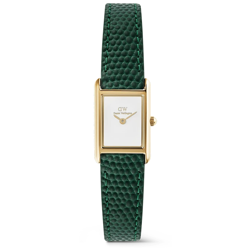 Den rektangulära designen ger ett tidlöst uttryck, samtidigt som det gröna bandet skapar en modern kontrast som lyfter både vardagskläder och mer uppklädda looks. Bandet är tillverkat av kromfritt äkta läder och präglat för att skapa en taktil, strukturerad yta. Det smalnar av för en bekväm passform och hålls på plats med ett polerat spänne. Ett japanskt kvartsurverk säkerställer pålitlig precision, vilket gör modellen till en trygg följeslagare genom hela dagen.