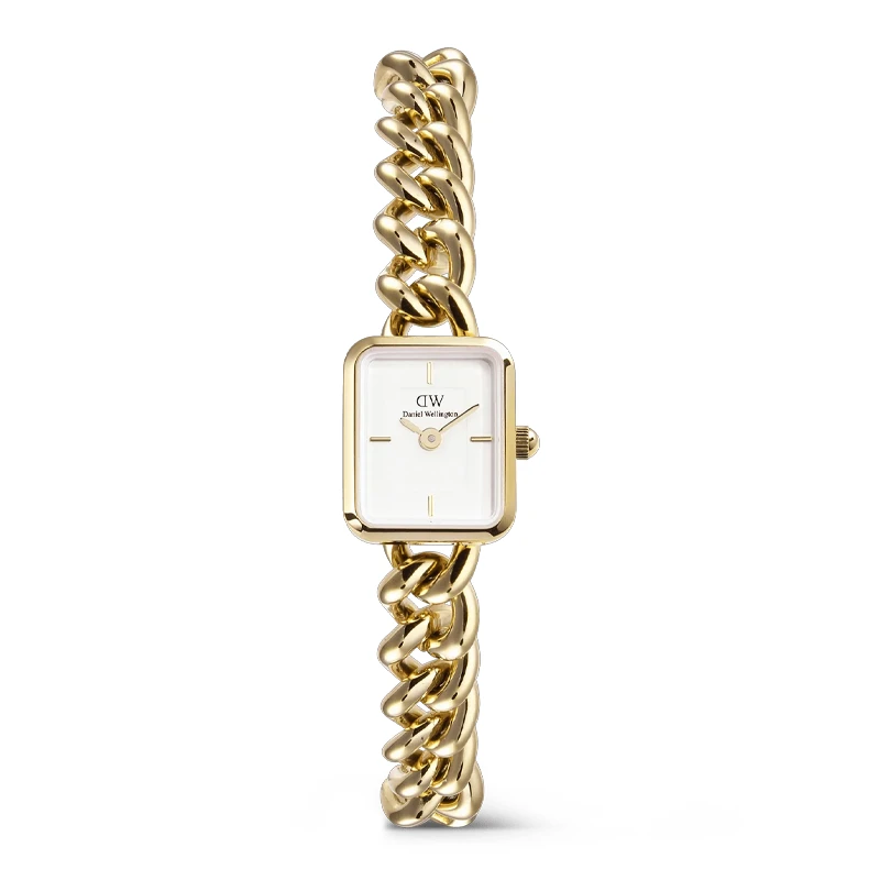 Boetten mäter 15,4 × 18,2 mm och har en tunn profil på 6 mm. Armbandet är 8,9 mm brett och fästs med spring bars. Klockan är tillverkad i 316L rostfritt stål med PVD‑plätering i guld, och urtavlan är vit med mineralglas. Armbandet är en kedja i guldton och är inte utbytbart. Drivs av ett japanskt kvartsurverk och är regntålig upp till 3 ATM.