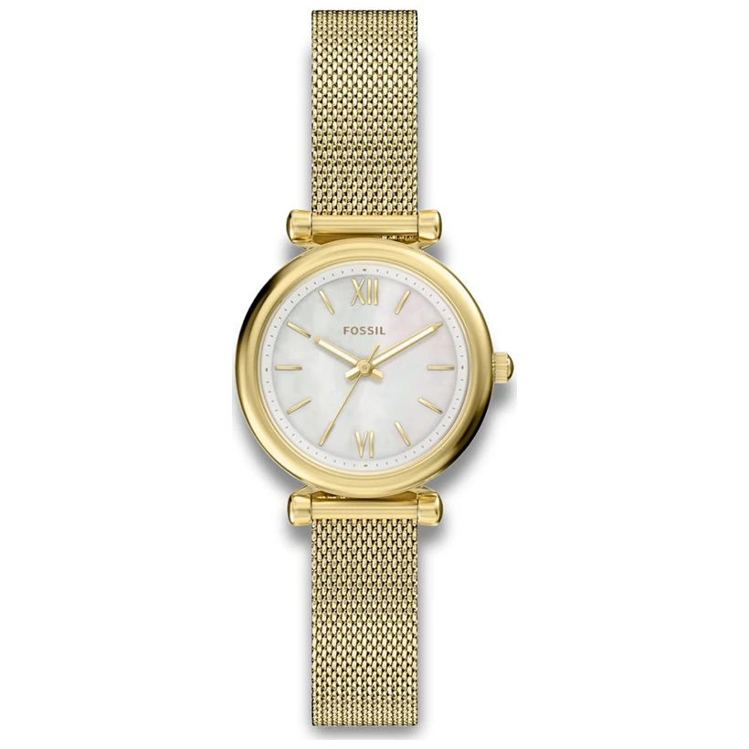 Fossil Jacqueline – elegant guldfärgad klocka med pärlemor-urtavla Den glansiga pärlemorvita urtavlan skapar en luminös och sofistikerad bas mot boetten i guldfärgat rostfritt stål, kompletterad med slanka visare och index för ett stilrent uttryck. Det guldfärgade mesh-armbandet i rostfritt stål ger en ljus kontrast och är utrustat med ett justerbart säkerhetsspänne, vilket ger en komfortabel och personlig passform. En tidlös och elegant klocka som fungerar lika bra till vardag som fest.