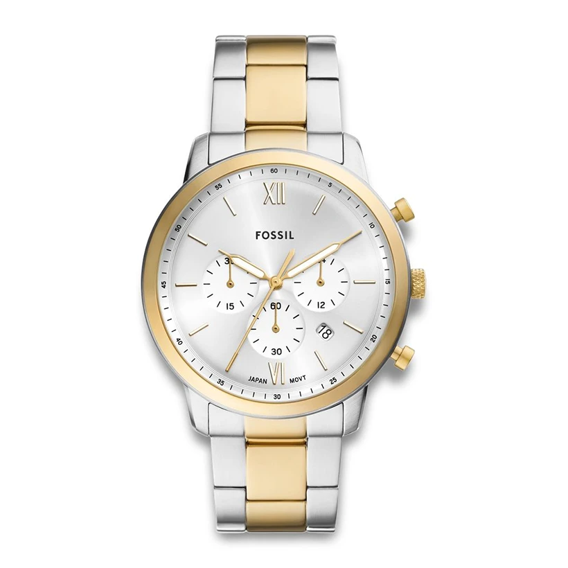 Fossil Neutra Chronograph – stilren tvåtonad klocka med mid-century-inspiration Neutra Chronograph förenar modern design med funktionalitet, inspirerad av mid-century-arkitektur. Den har en välbalanserad boett med tvåtonad finish, en minimalistisk silver sunray-urtavla och ett kupat mineralglas som tillsammans skapar en tidlös och ikonisk look. Japanskt kvartskronografverk säkerställer precision och pålitlig tidtagning. Designad för mannen som rör sig mellan pendling, kontorsmöten och kvällsaktiviteter, löser Neutra problemet med “från skrivbord till kvällsdrink”: tillräckligt stilren för presentationer, avslappnad nog för helgens aktiviteter, med praktiska kronografverktyg som används dagligen. Boetten är proportionerligt balanserad – stor nog för tydlig avläsning men fortfarande smal nog att glida under skjortmanschetten. Tvåtonat rostfritt stål tål vardagens slitage, resor och daglig användning, samtidigt som det harmoniserar med silver- och guldsmycken. Klockans kvartsurverk kräver ingen uppdragning eller rutin – bara sätt på och använd, vilket gör den enkel och pålitlig varje dag. Kronografens pushers ger funktion utan att kännas klumpiga. Med 5 ATM vattentålighet klarar den handtvätt, regn och spill, men är inte avsedd för simning. Neutra Chronograph är en vardagsklocka att behålla länge, med ren design och hållbar konstruktion som växer med din stil snarare än mot den. Perfekt för både arbetsdagar, resor och helgaktiviteter.