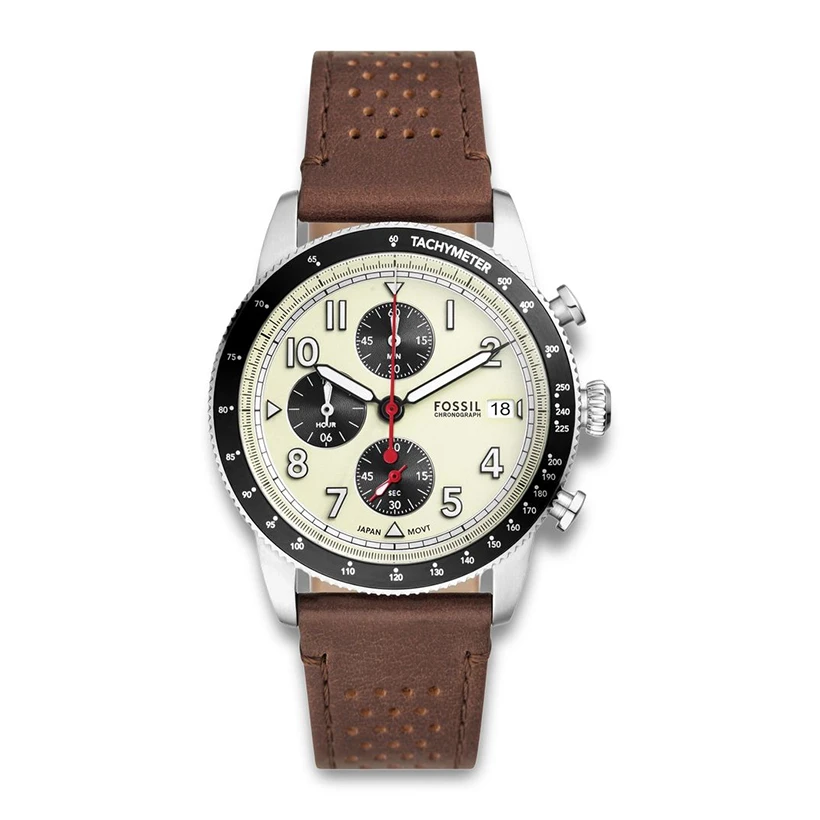 Fossil Sport Tourer – racinginspirerad kronografklocka Sport Tourer är designad för att fånga både funktion och den spännande energin från racing. Klockan har ett japanskt kronografurverk med centralsekund, en högpresterande tachymeterbezel och lysande timmarkeringar, vilket gör den redo för alla vägar du tar dig an. Boetten kombineras med ett läderarmband från Fossil, vars produktion stödjer ansvarsfull tillverkning via Leather Working Group. Resultatet är en sportig och tekniskt sofistikerad klocka som både mäter tid och höjer din stil – perfekt för vardag, äventyr eller racinginspirerade utseenden.
