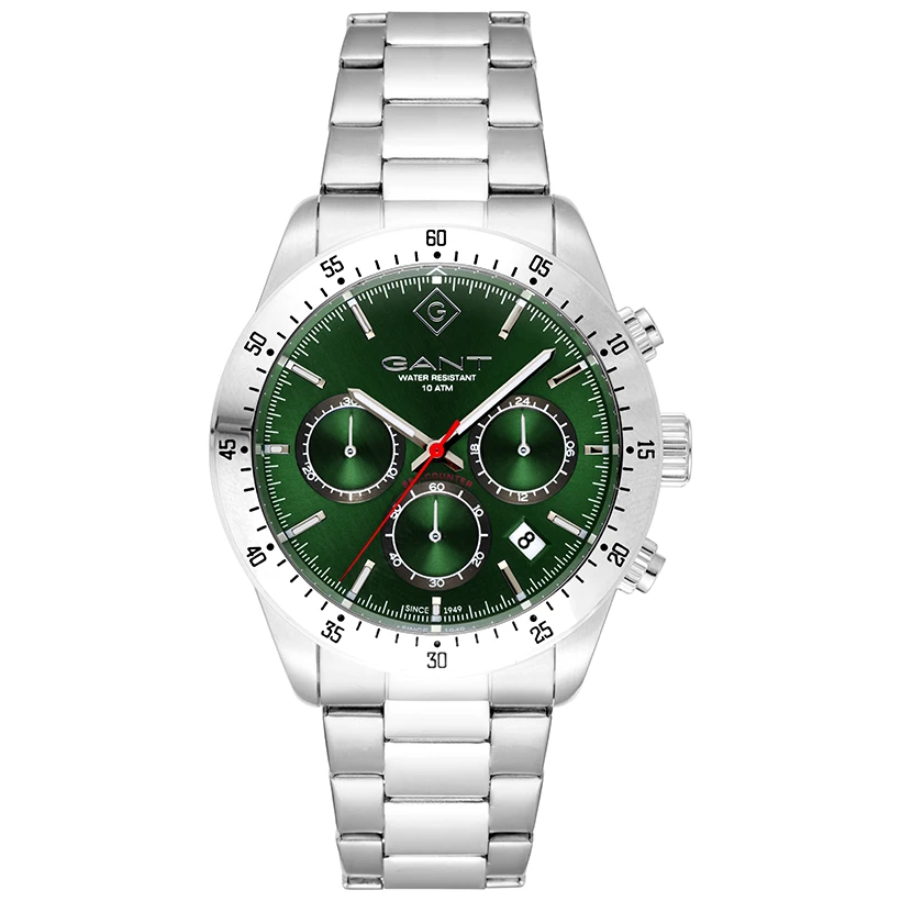 Gant Greenfield är en kronografklocka för herr som kombinerar sportig prestanda med ett kraftfullt och modernt uttryck. Den gröna urtavlan ger modellen en distinkt karaktär och skapar en dynamisk känsla som sticker ut både i rörelse och i vardag. Tydliga index gör tiden enkel att läsa även när tempot är högt.
