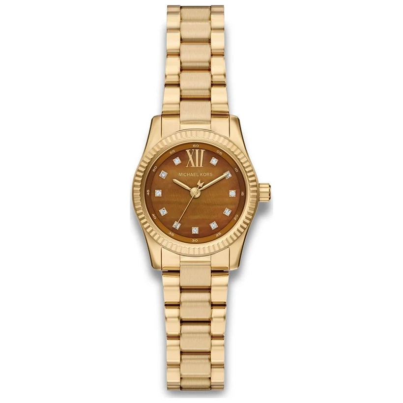 Lexington-klockan utstrålar vardaglig glamour med sin guldfärgade finish och gnistrande pavéaccenter vid timmarkeringarna. Denna mini-modell är helt tillverkad i rostfritt stål och har en exklusiv urtavla i äkta tigeröga som ger varje klocka ett unikt och levande uttryck. Den fasetterade toppringen och det matchande länkarmbandet förstärker den eleganta helheten. Bär klockan för att ge både vardags- och kvällsoutfits en sofistikerad och stilfull touch.