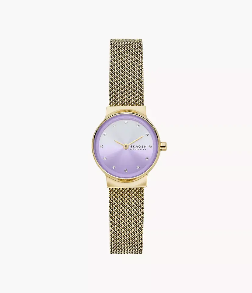 Den här 26 mm Freja Lille har en boett i rostfritt stål och en ombre-urtavla i lavendel med sunray-finish, prydd med gnistrande timmarkeringar. Klockan drivs av ett tvåvisarurverk och levereras med ett guldfärgat mesharmband i rostfritt stål. Armbandet är utbytbart, vilket gör det enkelt att anpassa stilen.