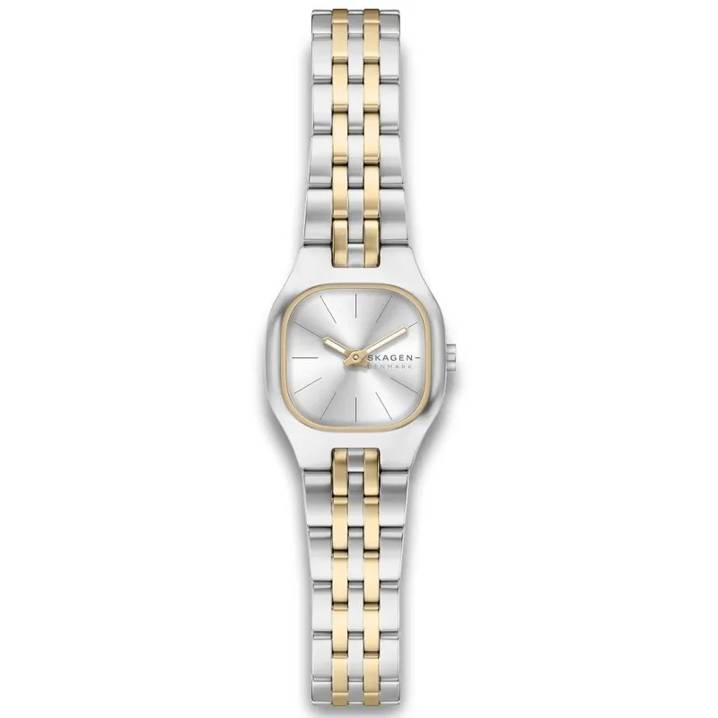 Denna lilla klocka kännetecknas av en tvåfärgad kuddboett och en matchande sunray-urtavla. Modellen kompletteras av ett tvåfärgat armband i rostfritt stål med tvåknapps fold-over-spänne, vilket skapar en stilren och modern finish.