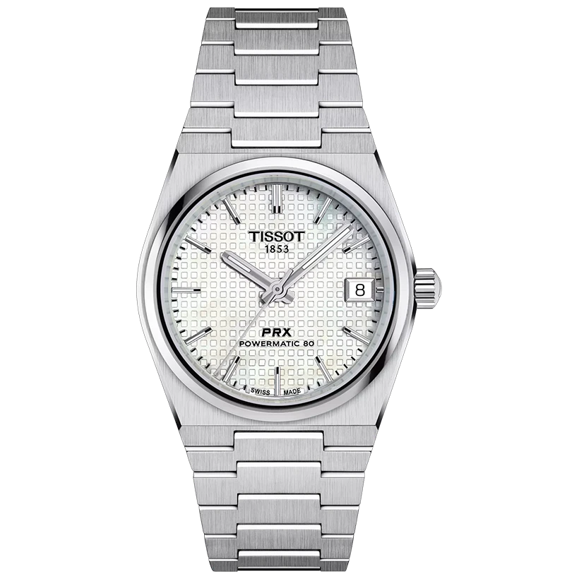 Den slimmade tonneauformade boetten och det integrerade stålarmbandet är direkt inspirerade av originalmodellen från 1978 och skapar PRX‑kollektionens omisskännliga silhuett. Urtavlan i äkta vit pärlemor fångar ljuset på ett levande sätt och skiftar naturligt i nyans – varje klocka är unik. Det diskreta ”waffle”-mönstret tillför struktur och ger modellen ett mer mångsidigt, nästintill unisex uttryck jämfört med klassiska pärlemortavlor. Med sin diameter på 35 mm sitter klockan elegant och bekvämt på handleden, idealisk för dig som uppskattar klassiska proportioner och hög bärkomfort.